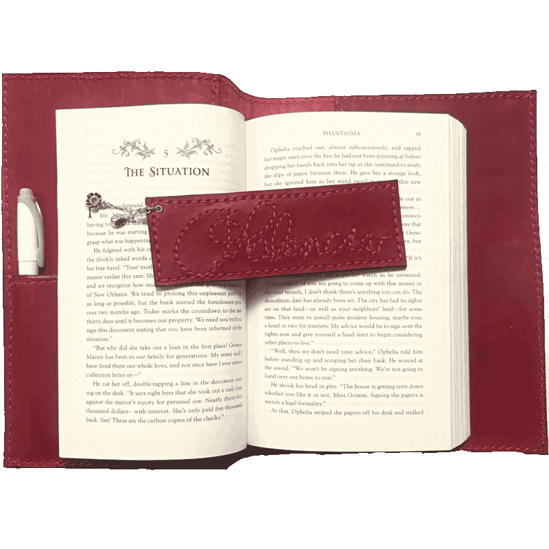 This bookmark is hand dyed and hand stitched vegetable-tanned leather, satin finish. It develops a patina over time.